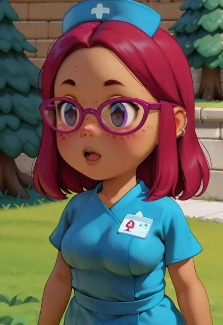 | トレーニングワード | <lora:M4ru_sdv:1>コピーしました! maru_sdv, violet eyes, red hair, medium hair, freckles, blush, full lips, glasses, ear piercings,コピーしました! glasses down, glasses on nose,コピーしました! facemask, surgical mask,コピーしました! nurse, nurse uniform, blue nurse uniform,コピーしました! socks, ankle socks, crocs, purple crocs,コピーしました! |