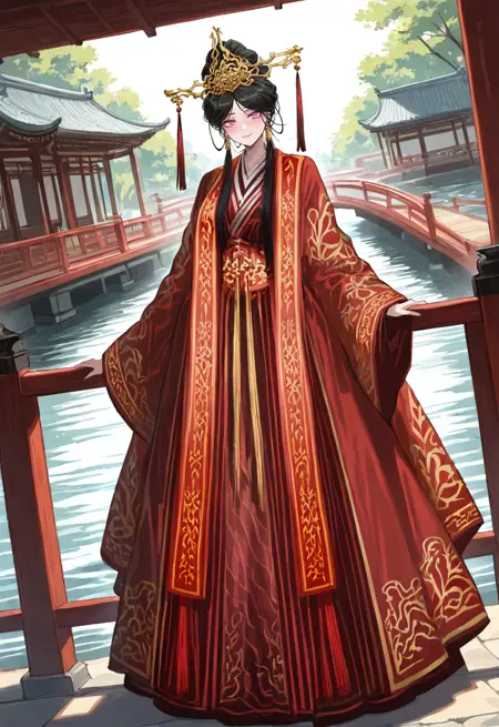 red hanfu, ornate red robe, wide sleeves, gold trim