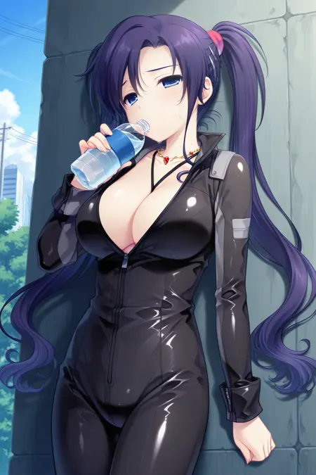 yae-bikesuit, black bikesuit, partly unzipped, cleavage, necklace, bodysuit,