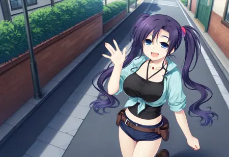 yae-casual, black tank top, blue tied shirt, necklace, midriff, belt, denim shorts, short shorts, brown boots,