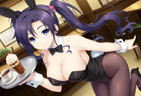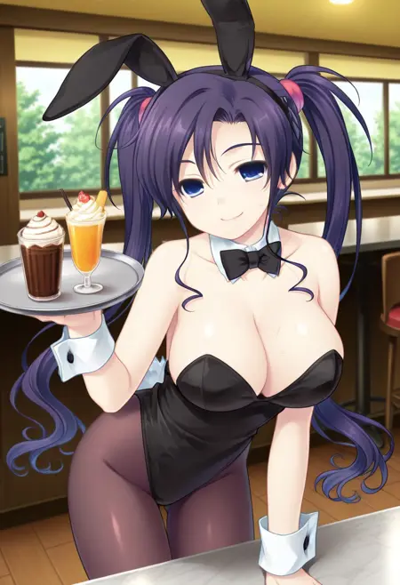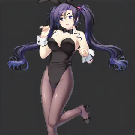 yae-bunny, bunny suit, fake bunny ears, black leotard, detached collar, black bowtie, wristcuffs, bare shoulders, pantyhose, black high heels,