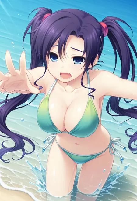 yae-&sora, purple hair, long hair, twintails, hair between eyes, side locks, hair clip, blue eyes, large breasts,