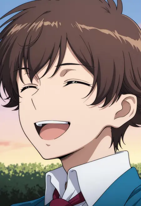 1소년, 남성 중심, 단독, 파란 눈, 갈색 머리, 교복, 흰 셔츠, 칼라 셔츠, 빨간 넥타이, 파란 재킷, 벌어진 재킷, 벨트, 회색 바지, 운동화,