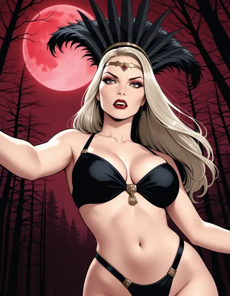 肌の黒い女性、茶色のハーネルネックビキニ、ハイレグビキニ、大きな頭飾り、頭飾りの羽、化粧、赤い唇、額のバンド、黒い爪、鎖骨、裸の首、胸元、片腕に一つの腕輪、(スパイラル腕輪)、裸の腕、中央の装飾
