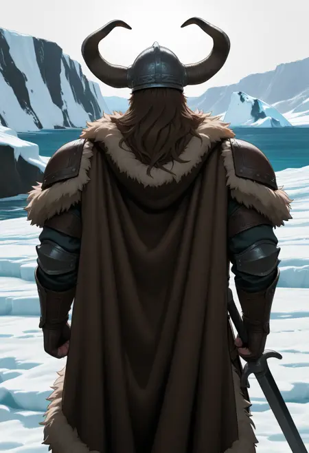 horned helmet, fur cloak, brown cloak, leather armor, round pauldrons, spiked bracers, belt, large buckle