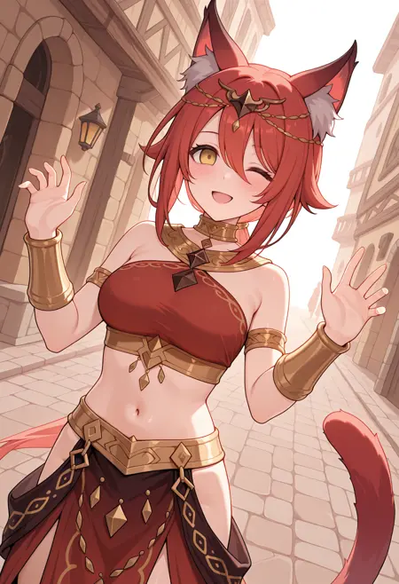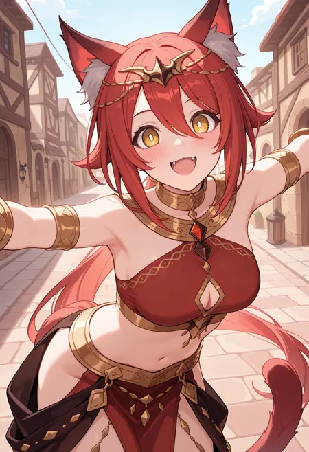 - pairahar, circlet, harem outfit, red crop top, gold collar, clothing cutout, jewelry, midriff, armlet, bracer, skirt, hip vent,