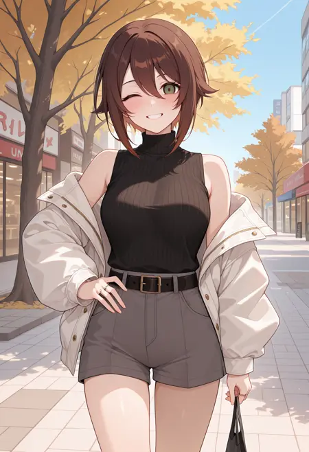 高领毛衣, 裸露肩膀, 黑色毛衣, 露肩, 白色夹克, 开襟夹克, 腰带, 灰色短裤,