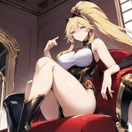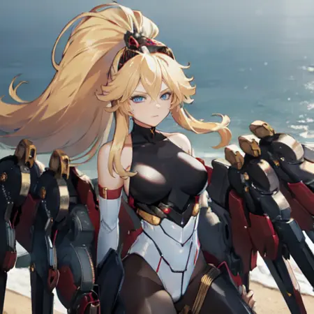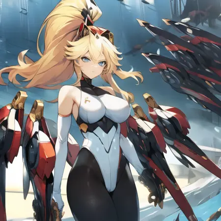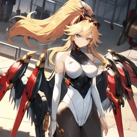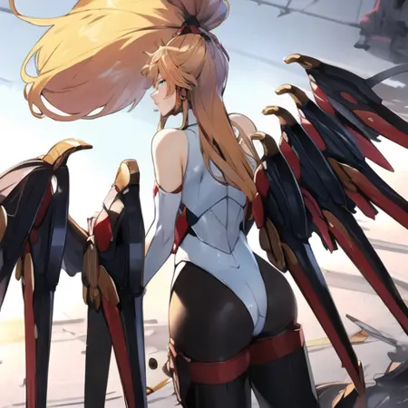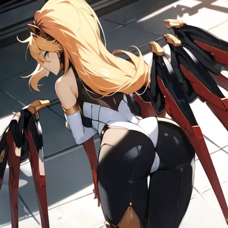 1girl,AG Milvus,金发,蓝眼,大胸,长发至极,高马尾,丝袜,连裤袜,侧发缕,裸肩,翅膀,头饰,机械翅膀,紧身衣,