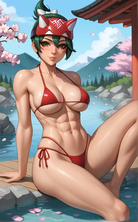 RedBikini_Kiriko_ownwaifu, 1girl, 3d, 胸, 鎖骨, フェイスペイント, 顔のマーク, 緑色の髪, 短髪, 水着, 目の間の髪, 髪のリボン, 胸元, レッドビキニ, 大きな胸, 白いリボン, 狐のマスク, 唇, 裸肩, 茶色の目, へそ, 頭上マスク, ツインテール, ハイポニーテール, 半分マスク, ハイレッグビキニ, マイクロビキニ, アンダーブブ, 顔のタトゥー, ショートポニーテール, 前髪, 緊張した, ハルターネック, メイク, 鼻, 赤い頭飾り, サイドタイビキニボトム, スキンインデント, ストラップギャップ, ストリングビキニ, 太もも, 腹筋,