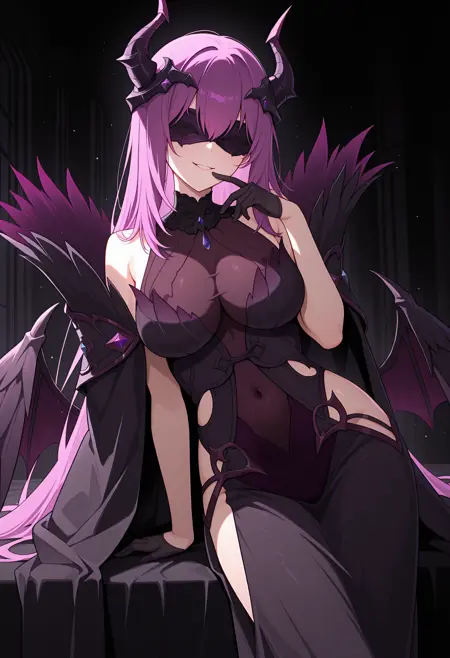 perisdef, 머리 장식, 검은 목줄, 소매 없는 드레스, 검은 드레스, 속에 레오타드, 엉덩이 절개, 검은 장갑, 날개, 망토, 진한 보라색 레오타드, 배꼽 가린 상태, 긴 드레스,