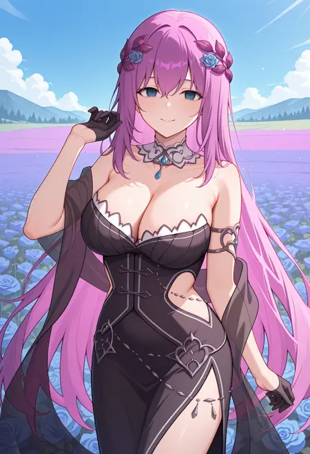 - perisd2s, 파란 장미, 월계관, 분리된 목줄, 스트랩レス 드레스, 검은 드레스, 보디스, 흰색 트림, 측면 절개, 측면 슬릿, 팔보, 반투명 샤롤, 반장갑, 검은 장갑, 배 체인, 긴 드레스,