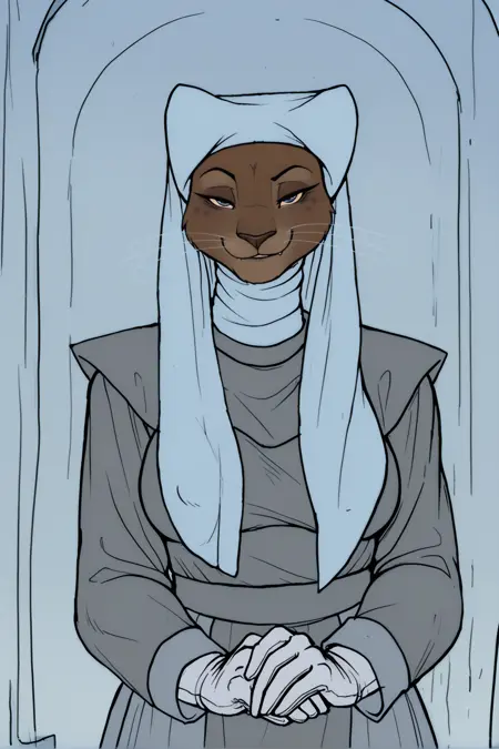 ドクター・フーの猫の修道女solo, female, anthro, feline, brown nose, nun, whiskers, eyelashes, grey clothing, freckles, white headwrap, nun outfit, front view, breasts, blue eyes, looking at viewer, brown fur, brown body, white gloves, 5 fingers, hand on hip, wide hips,