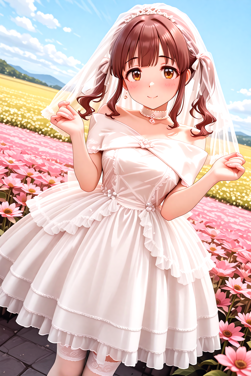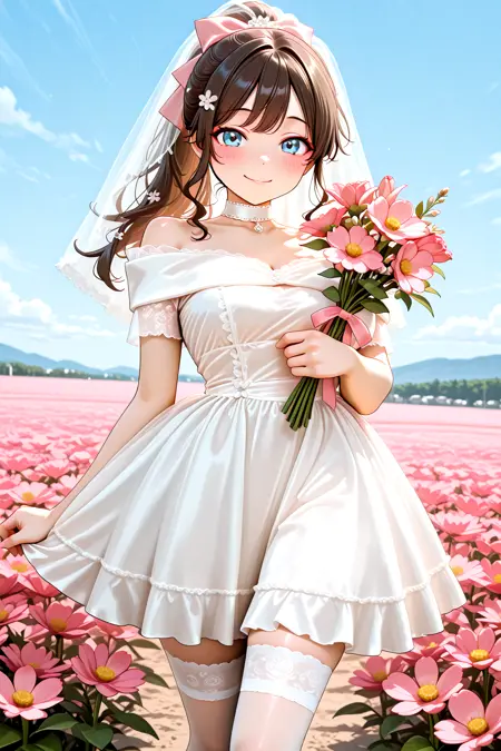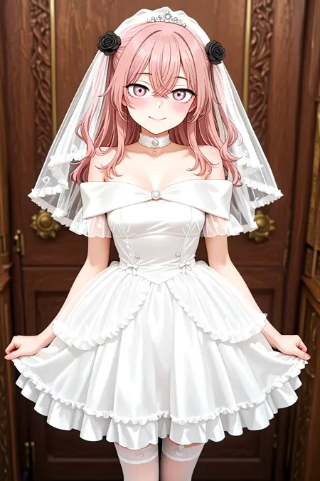 June_Wedding_Dress, white dress, wedding dress, off-shoulder dress, lace-trimmed dress, bridal veil, white veil, bride, frills, lace trim, white thighhighs, lace-trimmed legwear, white choker