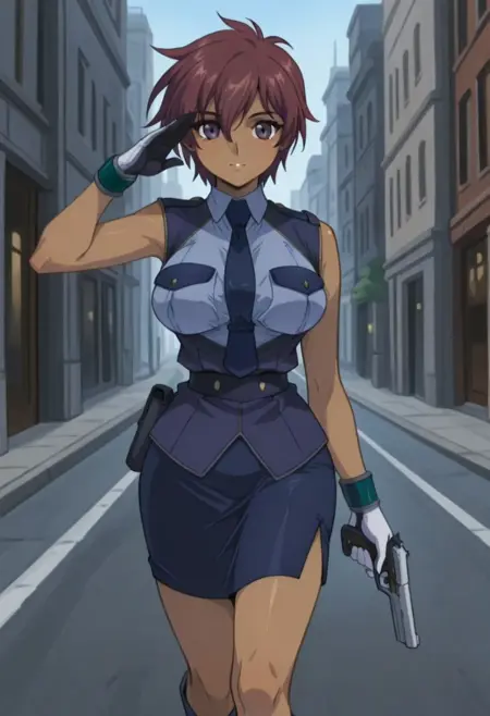 2. 경찰 유니폼masterpiece, best quality, amazing quality, lilScram, lilScram Police uniform, 1girl, solo, police woman, skirt, boots, holding pistol, saluting, in street, confident expression, high detail