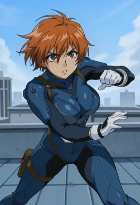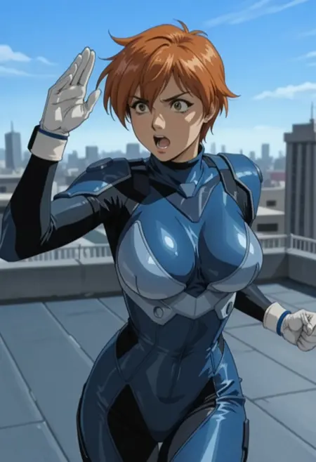 1. 전술 복장masterpiece, best quality, amazing quality, lilScram, lilScram tacticalbodysuit, 1girl, solo, blue bodysuit, wristband, white gloves, determined expression, action pose, rooftop, depth of field