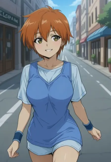 4. 캐주얼 복장 1masterpiece, best quality, amazing quality, lilScram, lilScram hair, causal outfit1, 1girl, solo, outdoors, street, walking, smiling, cheerful, wristband, depth of field