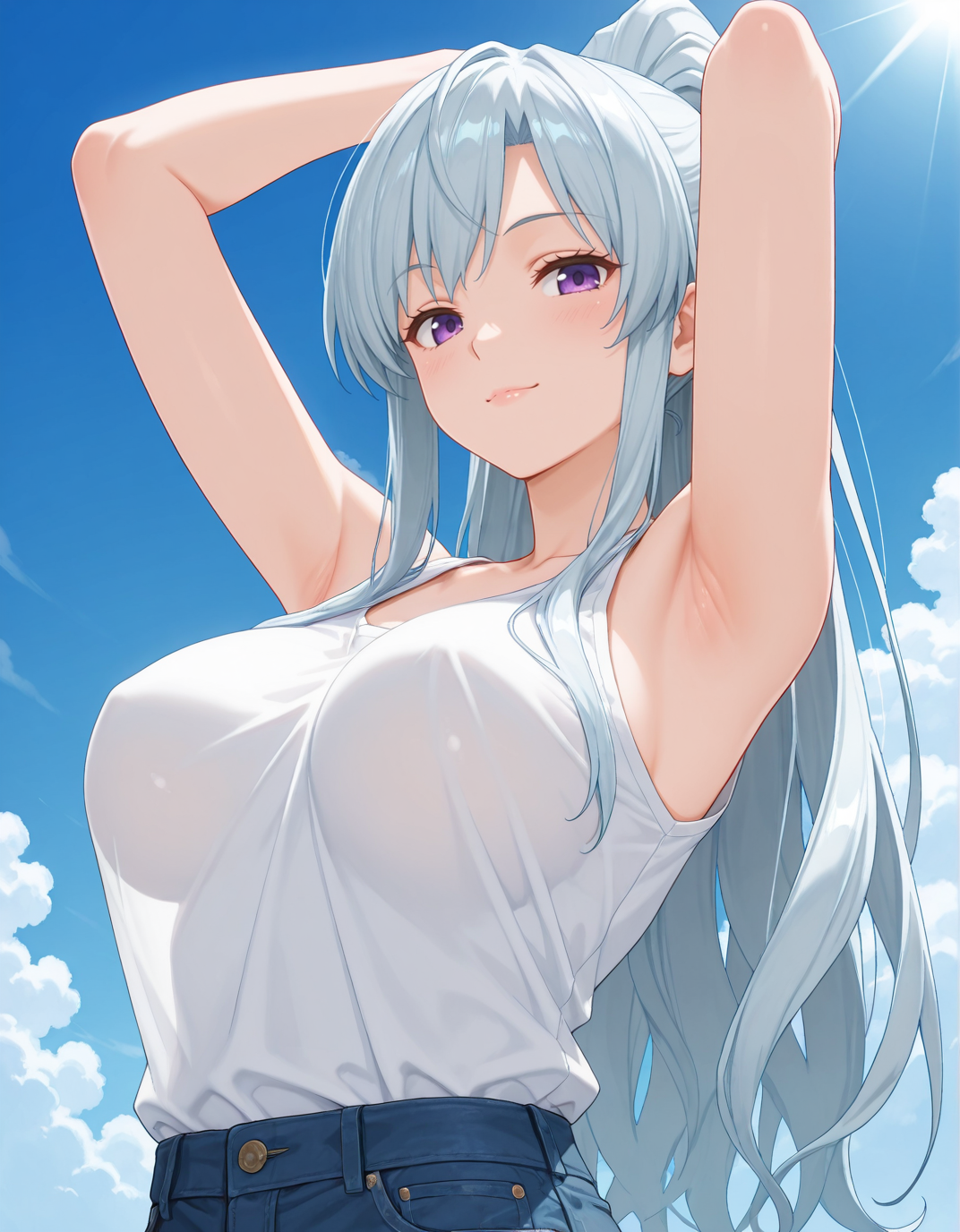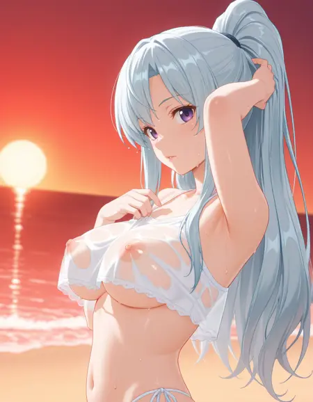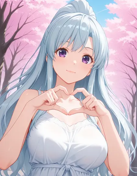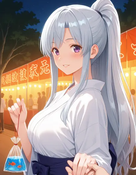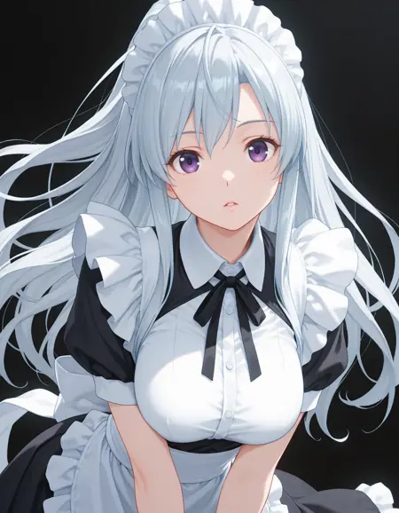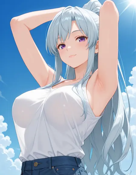 기본 트리거 단어: 은색 머리, 매우 긴 곧은 머리, 파니테일, 진보라색 눈, 얇은 입술, 큰 자연스러운 가슴