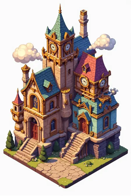 등각판 판타지 건축 디자인, 스팀펑크 스타일 저택, 황동-구리 톤, 기어로 장식된 벽, 증기 분출하는 굴뚝, 시계 메커니즘 테마의 세부 요소.