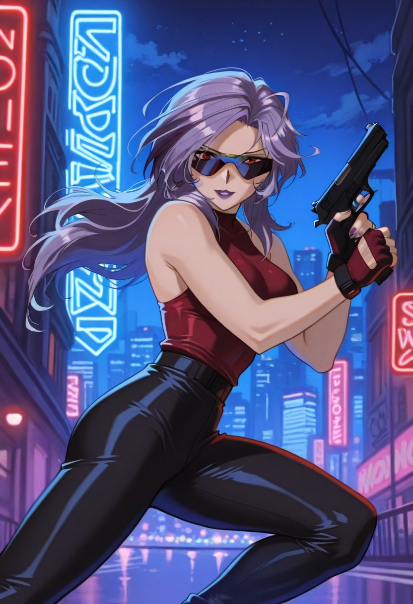 masterpiece, best quality, amazing quality, RubyEcxess, RubyEcxess Sunglasses, RubyEcxess hair, purple lips, makeup, fingerless gloves, 1girl, solo, red top, black pants, bare shoulders, night city, neon lights, holding pistol, action pose, full body, cinematic, cyberpunk