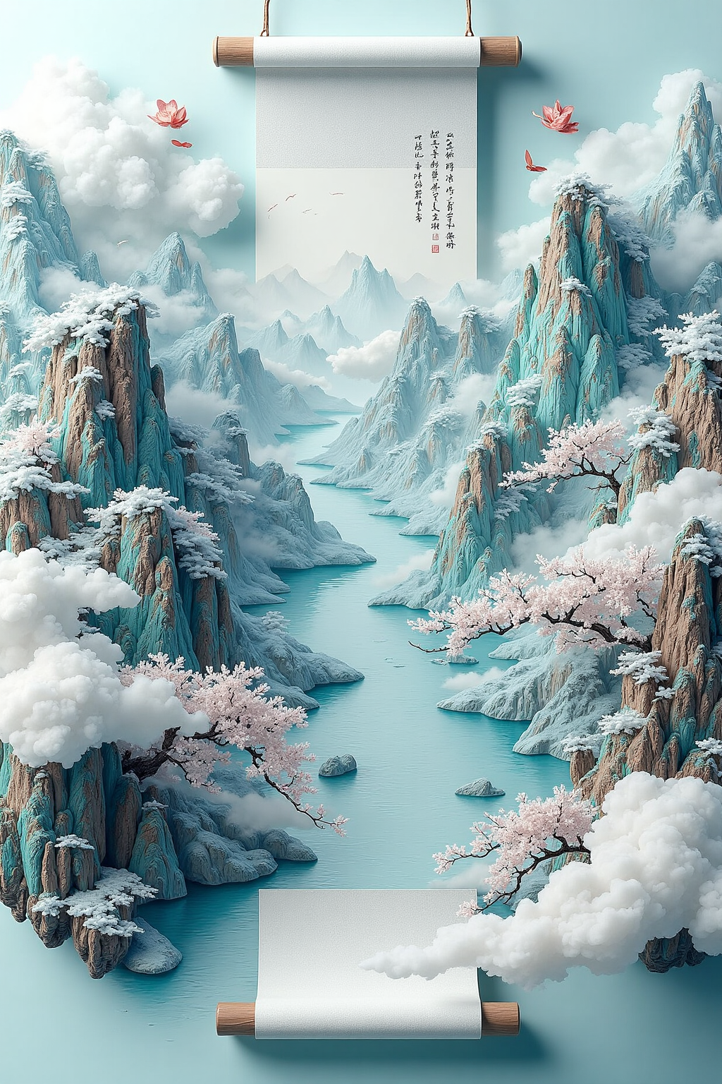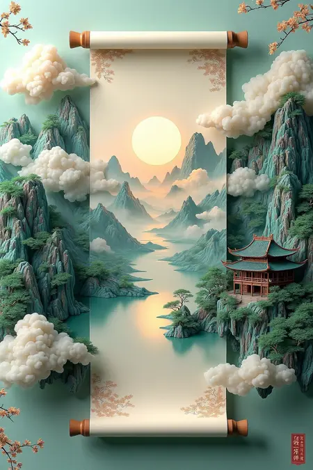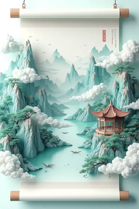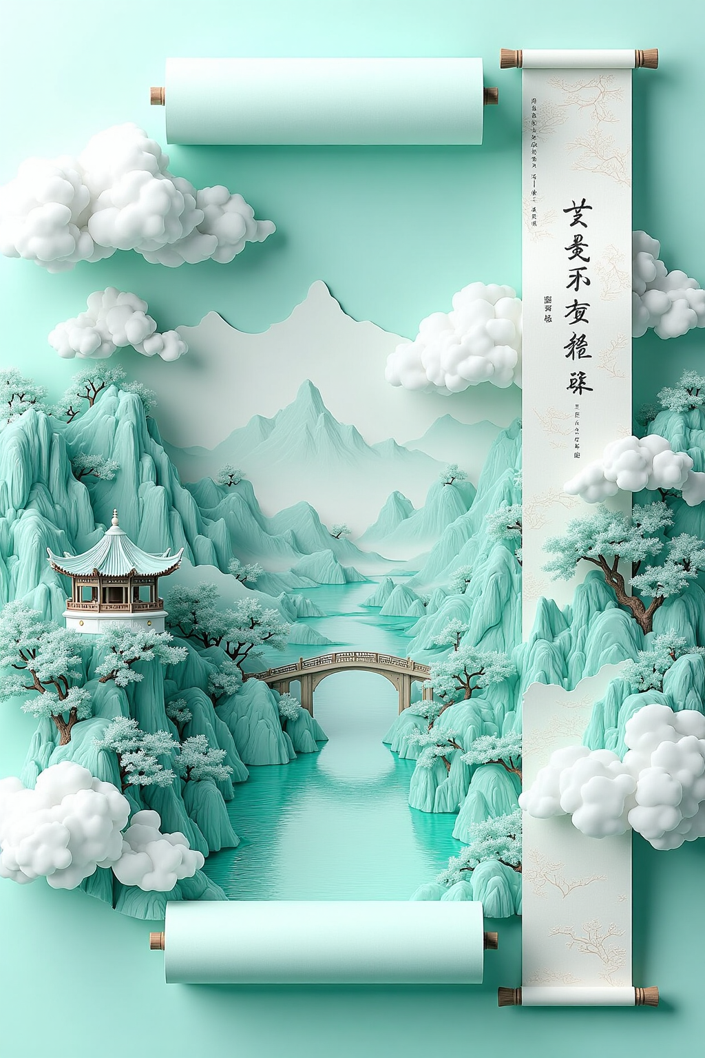 巻物のある中国風風景画、3D紙切り効果、薄いターコイズ色の背景、ふわふわした雲、古代の pavilions、流れる川、洗練された書道の巻物。