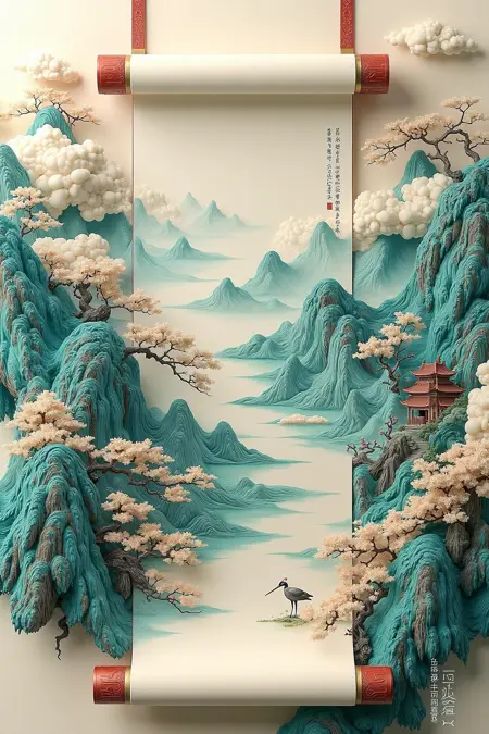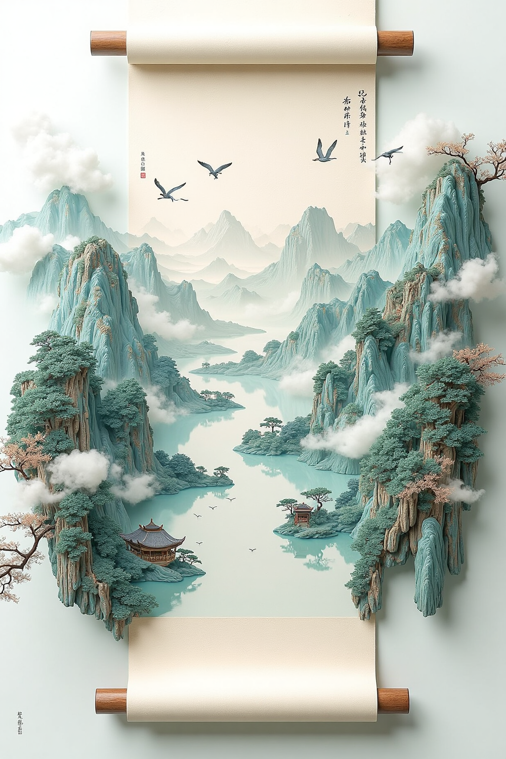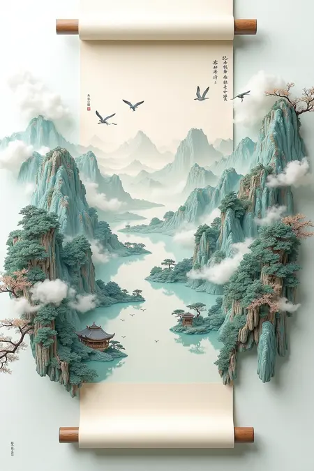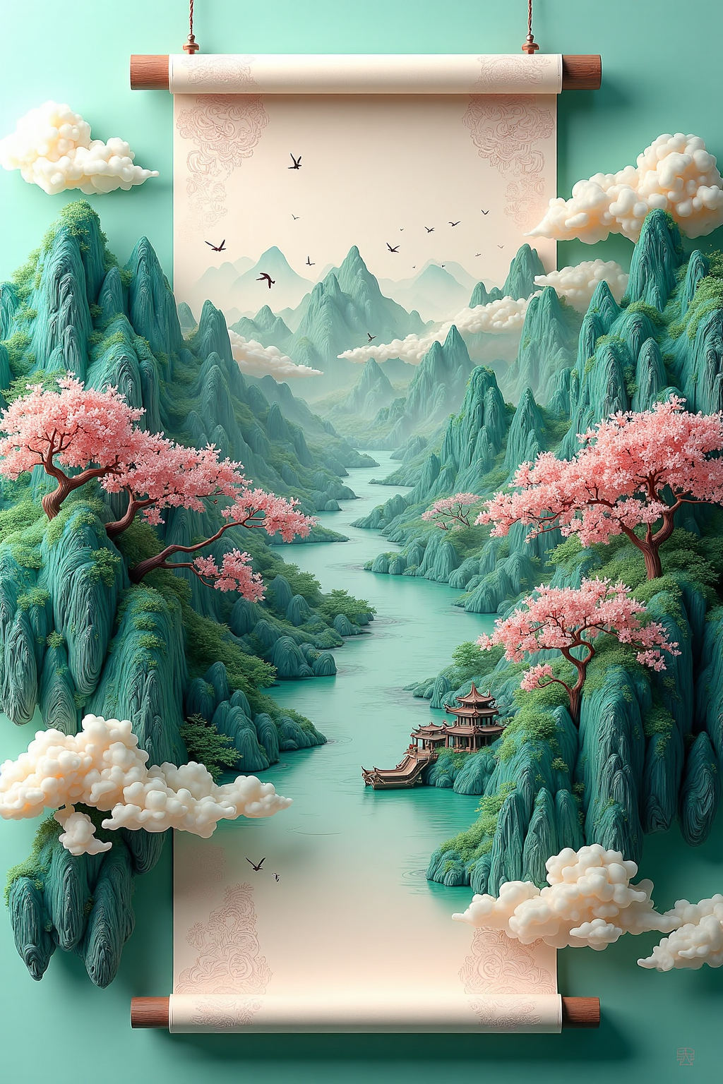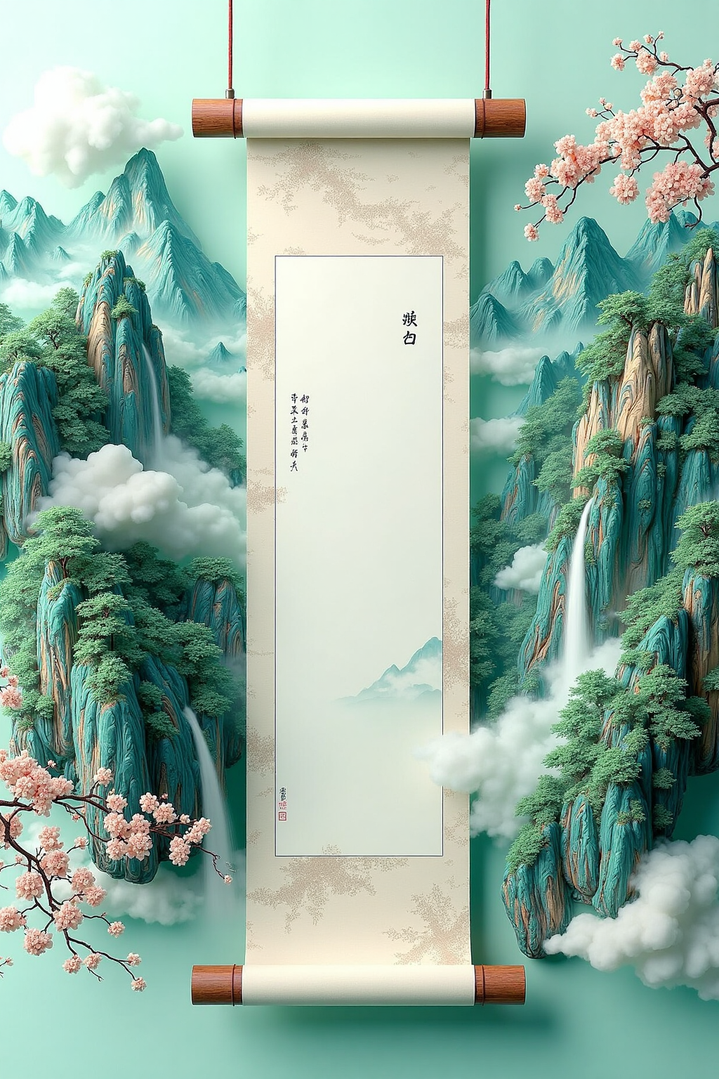 巻物のある中国風風景画、3D紙切り効果、薄いターコイズ色の背景、ふわふわした雲、古代の pavilions、流れる川、洗練された書道の巻物。