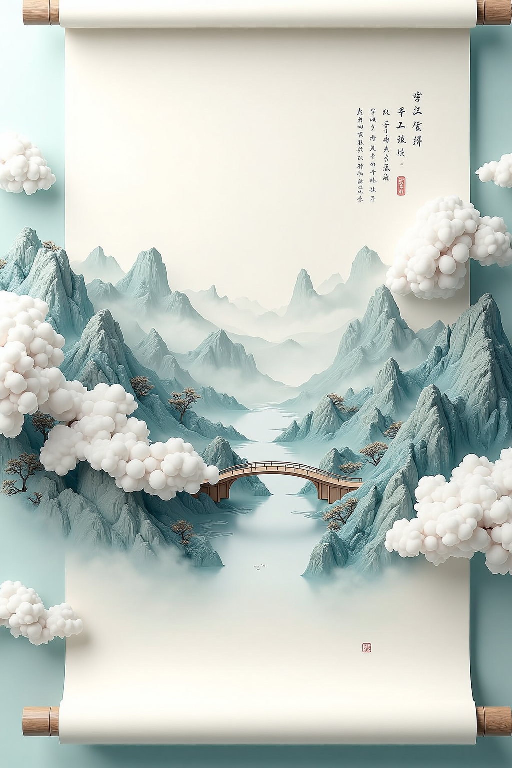 巻物のある中国風風景画、ミニマリストデザイン、白い雲、灰色〜青い山々、小川の上の小さな橋、部分的に巻かれた巻物。