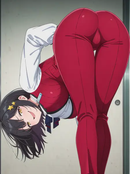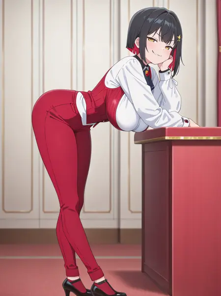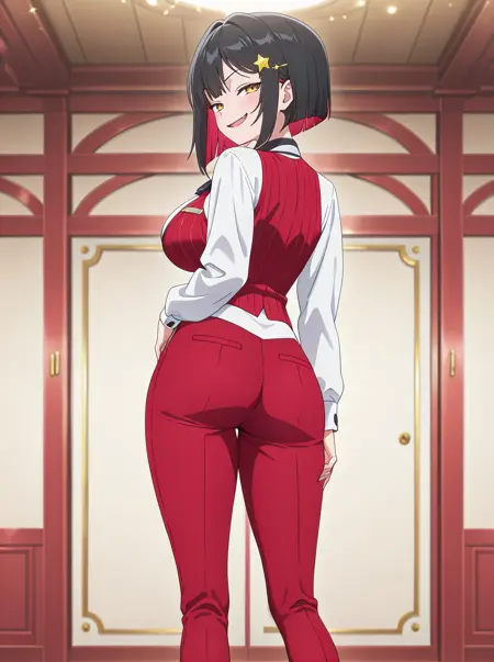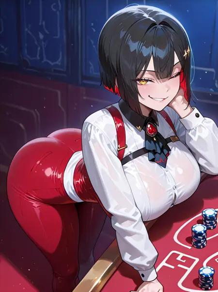 ジャックポット: rougenikkedef white_shirt、赤いズボンのヘアクリップ、赤いベスト、星型の髪飾り、ハイヒール