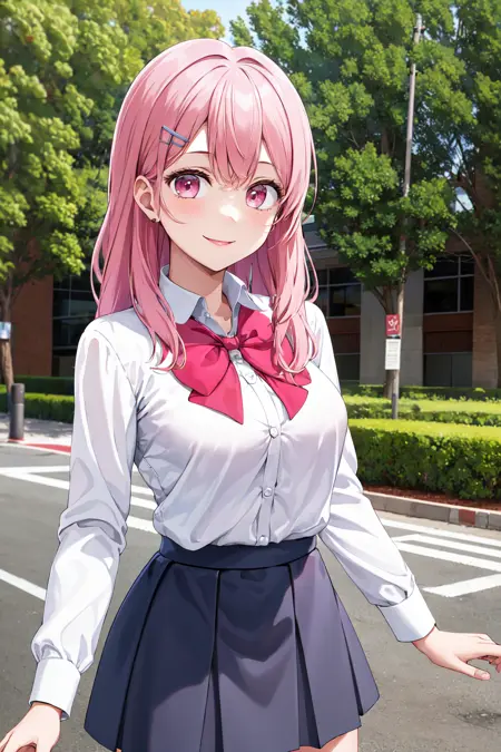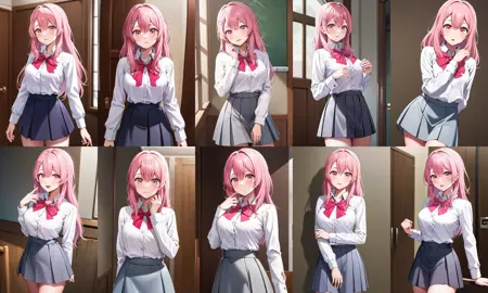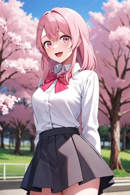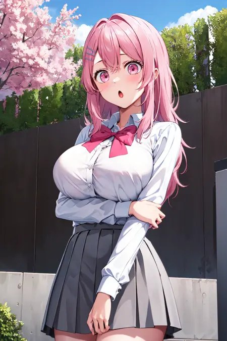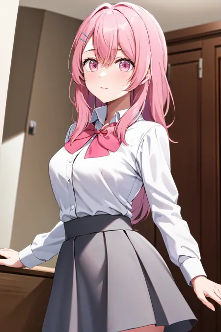 衣装11girl, solo, long hair, pink hair, hairclip, bangs, pink eyes, school uniform, pink bow, white shirt, collared shirt, long sleeves, grey skirt