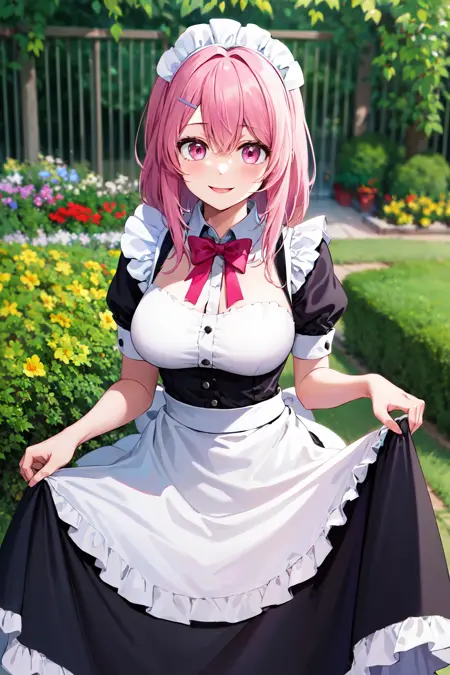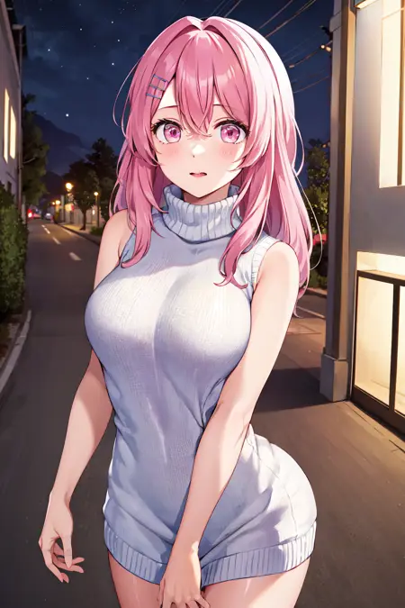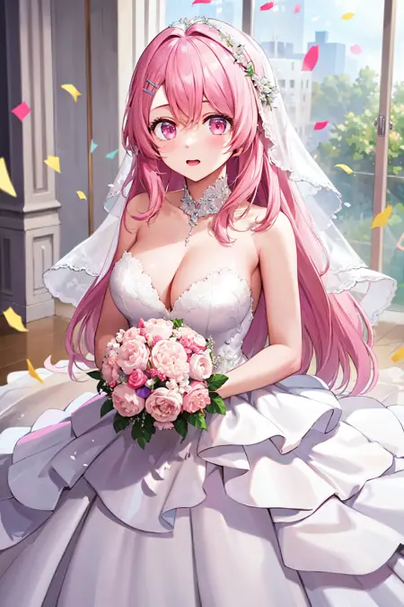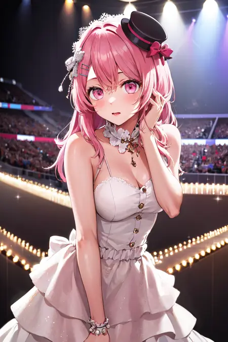 推奨プロンプト1girl, solo, long hair, pink hair, hairclip, bangs, pink eyes, dress, mini hat, idol clothes, stage