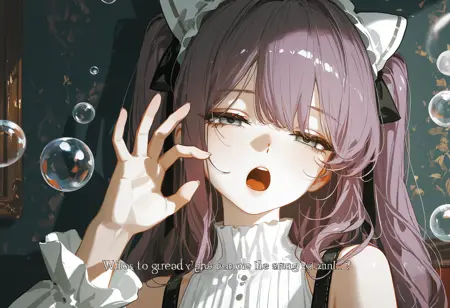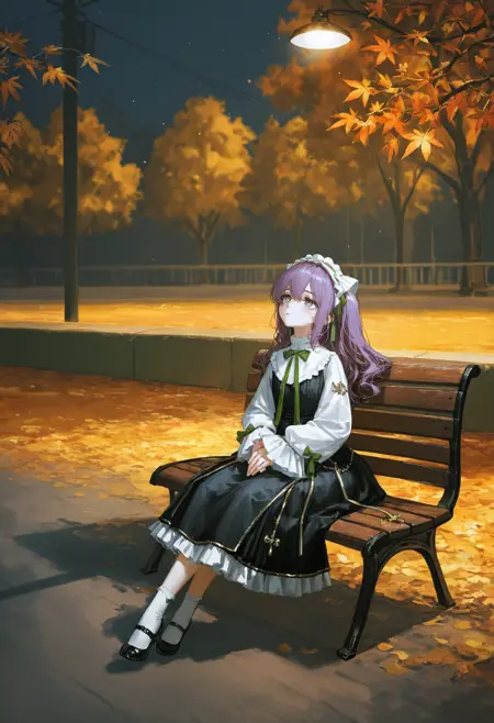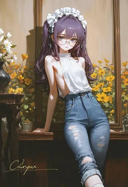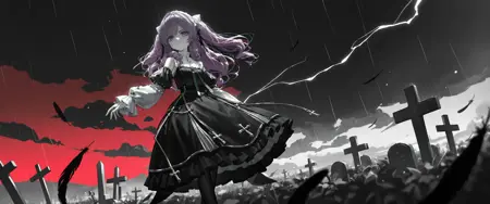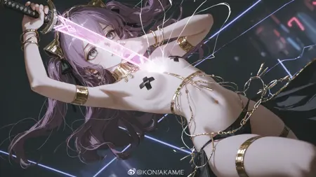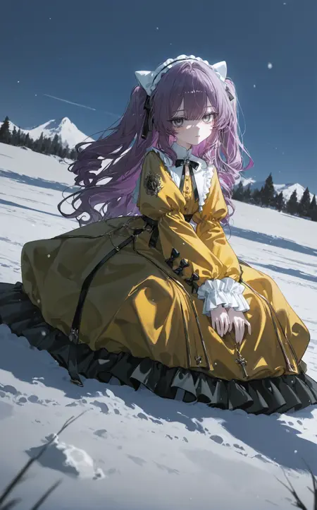 태그: 긴 머리, 보라색 머리, 회색 눈, 양쪽 위로 올린 머리,