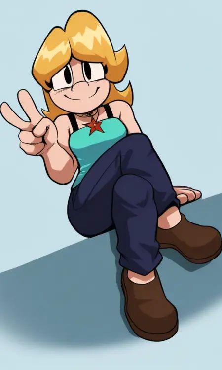 RoseSML,1girl,blonde hair,black eyes,cyan tank top,black straps,dark blue pants,star necklace,necklace,shoes,brown footwear,no bracalets