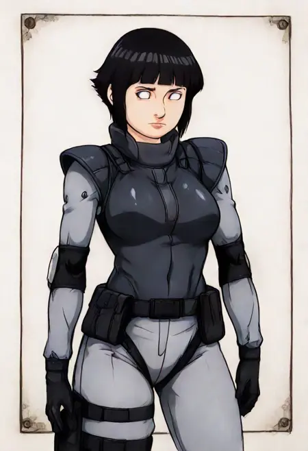 Mg1snk、後ろに分けた髪、グレーのバンダナ、濃いグレーのタクティカル・スニーキングスーツ、ブラックのタクティカルベスト、ショルダーパッド、ブラックのタクティカルグローブ、エルボーパッド、ハイホルスター、モジュラーハーネス、ニーパッド、銃、ブラックのコマンドブーツ