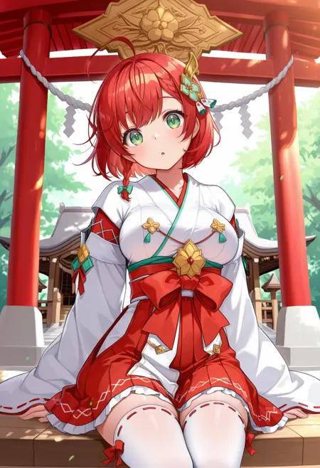 巫女、白い太ももハイ、リボントリム付き太ももハイ、片側の編み込み、
