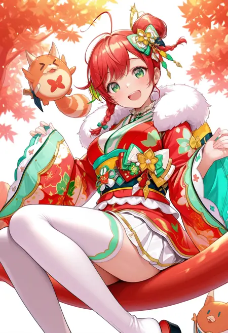 片側の編み込み、髪を結んだスタイル、着物、白い太ももハイ、ファーのトリム、広い袖、白いスカート、