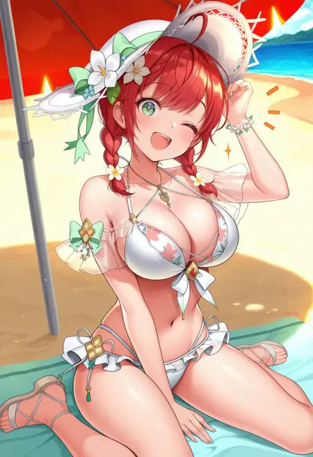 ツイン編み込み、白いヘアウェア、白いビキニ、髪飾り、透け感、太ももストラップ、