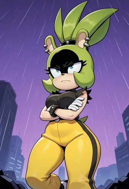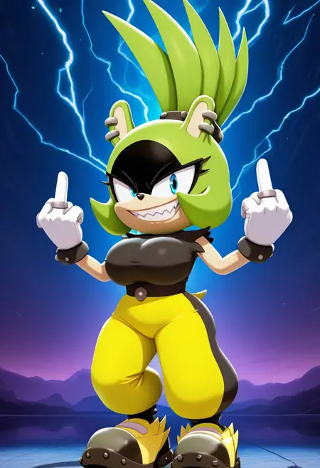 Surge the Tenrec, green fur, tall green quills, blue eyes, piercings, black shirt, baggy yellow pants, white gloves, spiky wristbands, yellow shoes