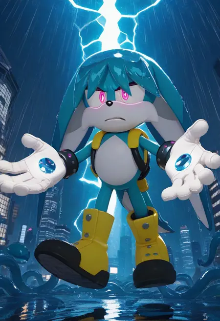 Kit the Fennec, blue fur, purple eyes, white muzzle, blue tail, white gloves, yellow shoes