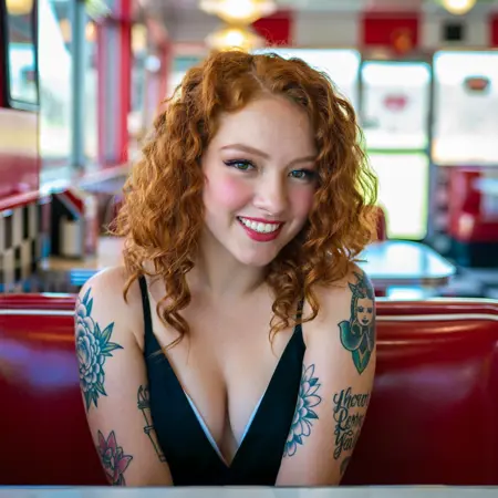 1nst4p1c 長い波状の赤髪の女性が、黒のレザージャケットと破れたジーンズを着て、屋上の縁に立っています。彼女の表情は無表情で、手は手すりに置かれています。身体は少し観客から離れた角度を向いていますが、視線はカメラに向かっています。手首には小さな星のタトゥーが見えます。背景にはぼやけた都市のライトとコンクリートの建物、金属構造が見えます。照明は柔らかく拡散され、夕焼けの温かい金色のトーンが含まれています。全体的な美学は都会的で少しエッジの効いたスタイルです。画像はよく構成されており、女性は鮮明に焦点が合わせられ、背景はややぼやけています。カメラの角度は目線レベルで、被写体を正面から捉えています。
