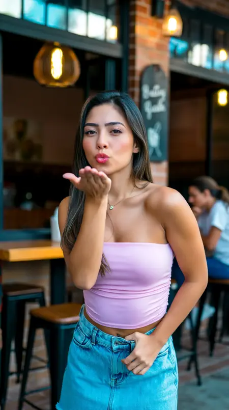 1nst4p1c 長い黒髪の女性が、白いクロップトップとレースのショートパンツを着て、ラップトップを膝の上に乗せてベッドに足を組んで座っています。彼女の表情は無表情で、指がキーボードに軽く置かれています。身体はほとんど見え、クロップトップで腹部が見えています。鎖骨に小さなタトゥーが見えています。背景にはぼやけたストリングライトと本が並ぶ木製の棚が見えます。照明は柔らかく拡散されており、肌に温かみのあるトーンを作り出しています。全体的な美学はカジュアルでややセクシーです。画像はよく構成されており、浅い被写界深度で女性に焦点を当て、背景は柔らかくぼやけています。カメラの角度はやや上方から、被写体を見下ろしています。
