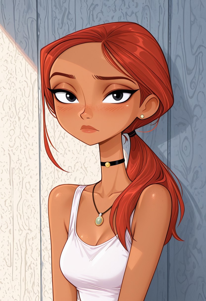 emma_stoked, long red hair, ponytail, dark-skinned female, black eyes,