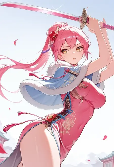 펑테일, 헤어 플라워, 빨간 꽃, 겉옷, 분홍색 중국 드레스, 털 장식, 등이 드러난 드레스,