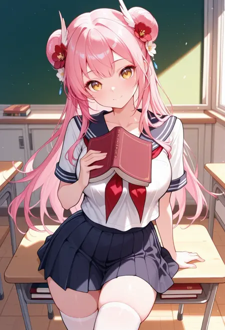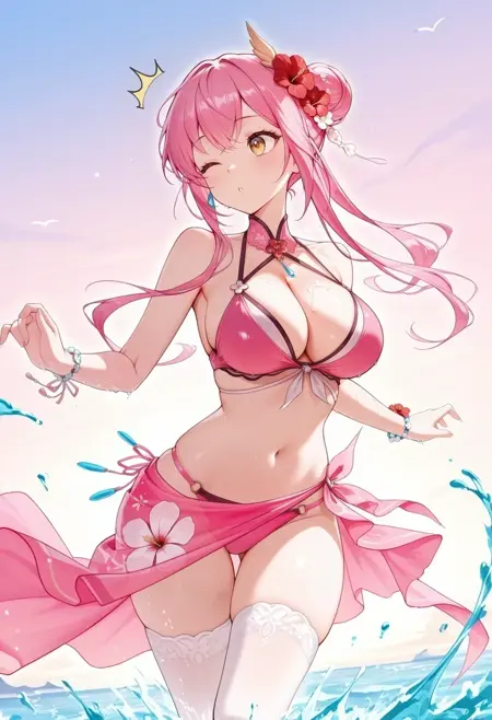 분홍 비키니, 단일 헤어 둥, 헤어 플라워, 빨간 꽃, 흰 허벅지 스타킹, 사롱,