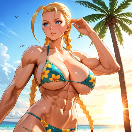 - トリガー:CammyStreetFighter, 1girl, 緑のレオタード, cammy white, ベレー帽, 金髪, 帽子, 二つ編み, 指なし手袋, 筋肉質, 大きな胸, 青い目, 二重編み, ハイレグレオタード, 顔の傷, 厚い太もも, 筋肉質な女性, 赤い手袋, 腹筋, 脇腹カバー, 赤い頭部装備, ハーネス, 太ももストラップ, スキンタイト, サンダルレオタード, 肩出し