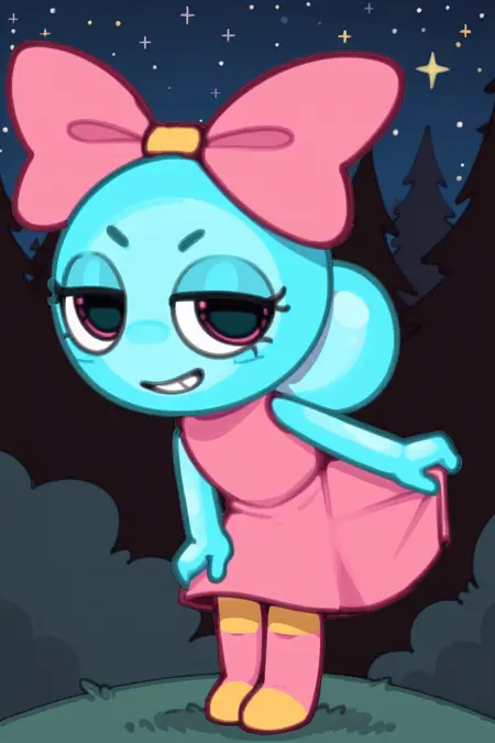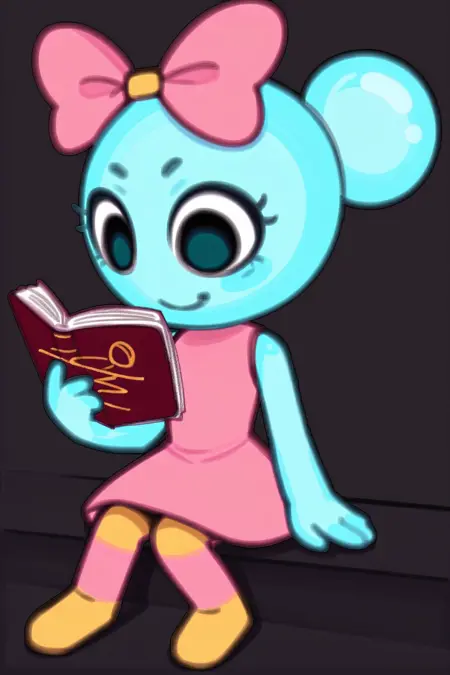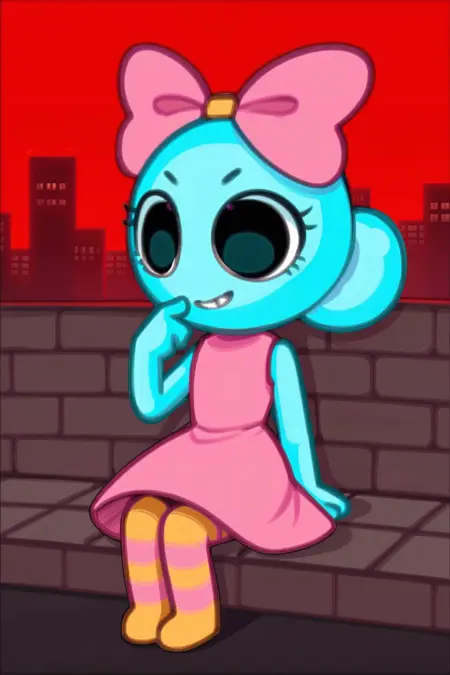 有益提示:1girl,黑眼睛,兽人,泡泡发髻,粉色蝴蝶结,粉色连衣裙,无袖连衣裙,条纹裤,圆形手,无手指,无鼻子