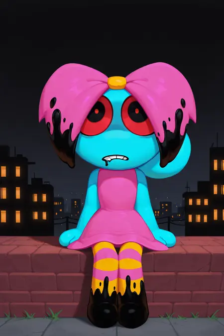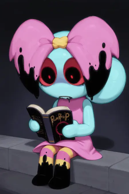 役立つキーワード: 1girl, black eyes, anthro, bubble_hairbun, black drool, pink bow, ruined bow, pink dress, sleeveless dress, striped tights, stained tights, circle hands, no fingers