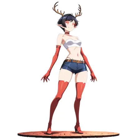 1girl, solo, antlers, short hair, black hair, pixie cut, swept bangs, red eyes, glowing eyes, small breasts, small ass, narrow waist, pointy ears, freckles, eye liner, cute, makeup, red choker, elbow gloves, red gloves, white tube top, (blue jean booty shorts), red thighhighs,