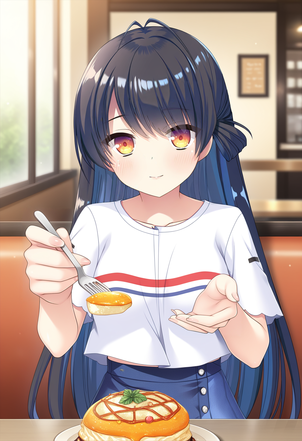CHANGFU,1girl,solo,antenna hair,straight hair,white cropped shirt,blue miniskirt,