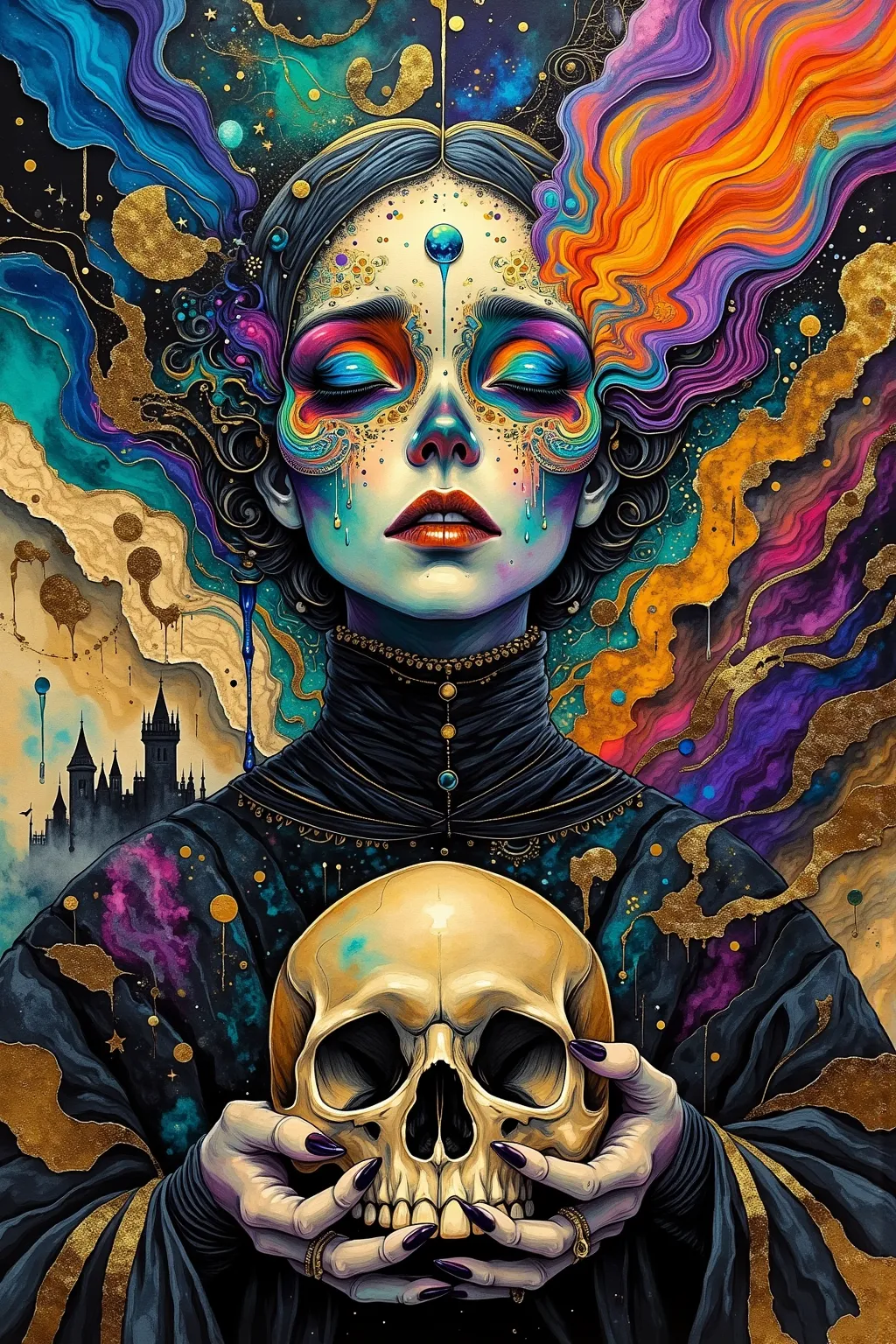 "An abstract art piece centered around a vividly surreal {{central_object}}, crafted with a fusion of diverse artistic mediums and styles. The {{glowing_part}} glows with intricate watercolor gradients, blending electric blues, fiery oranges, deep purples, and luminous greens, radiating outward like a mesmerizing kaleidoscope. The {{dark_void}} is a shimmering void of metallic black, reflecting light with a polished, glassy texture. Delicate ink linework traces {{external_details}} around the {{main_surface}}, interwoven with torn paper collage patterns that add layers of depth and texture. Bold acrylic brushstrokes create dynamic waves of color and motion surrounding the {{central_object}}, while splashes of luminous spray paint add bursts of energy and vibrancy. Encaustic wax provides smooth, glossy highlights on the {{central_object}}'s surface, contrasting with smudged charcoal details and pastel gradients in the surrounding space. Digital glitch effects and marbled textures weave through the composition, giving the piece a surreal and futuristic edge. Resin drips and metallic foils accentuate the **{{central_object}}'**s organic yet otherworldly quality, creating a stunning focal point in the chaos of abstraction. A hypnotic representation of perception and artistry, blending beauty and mystery."