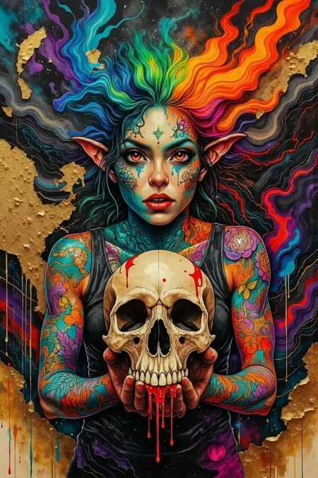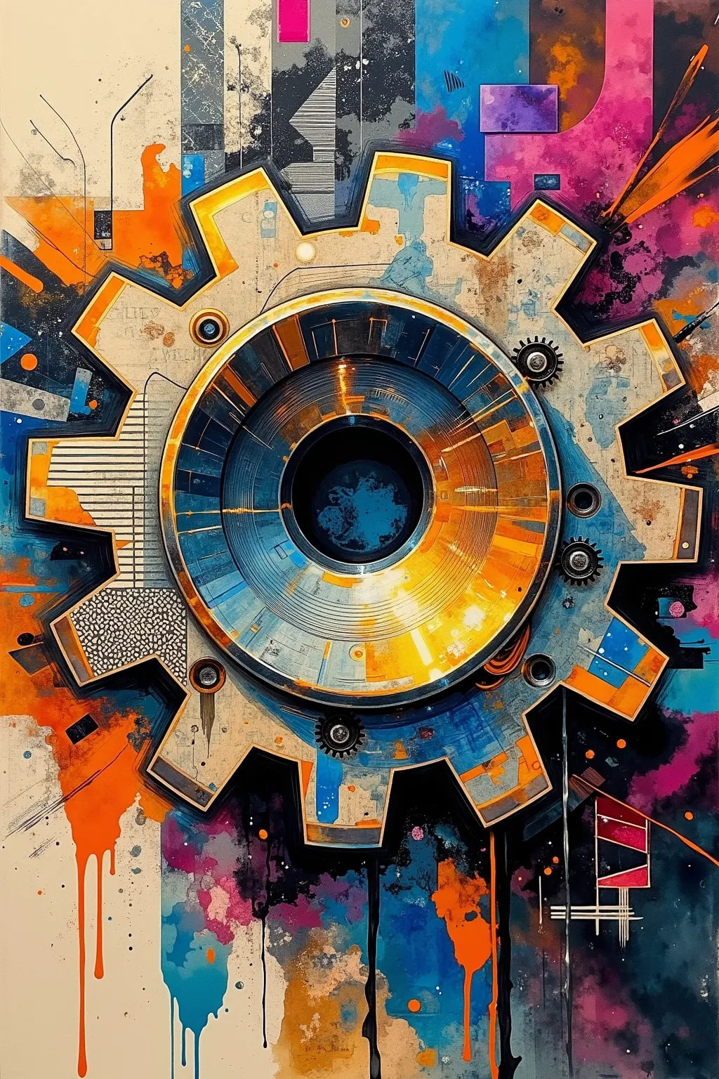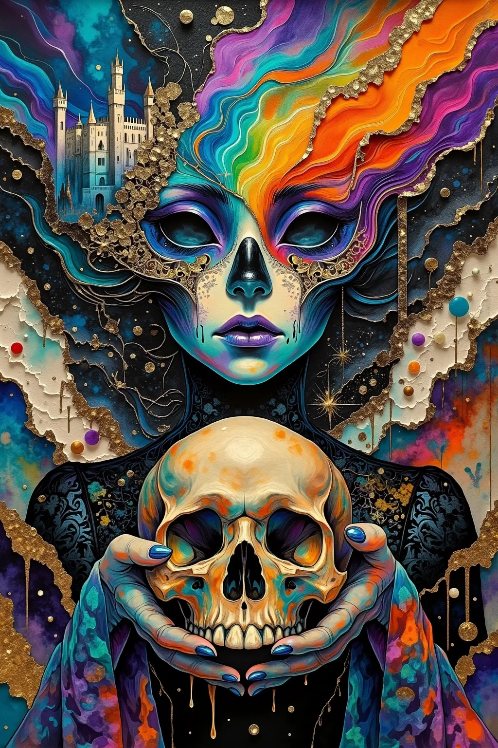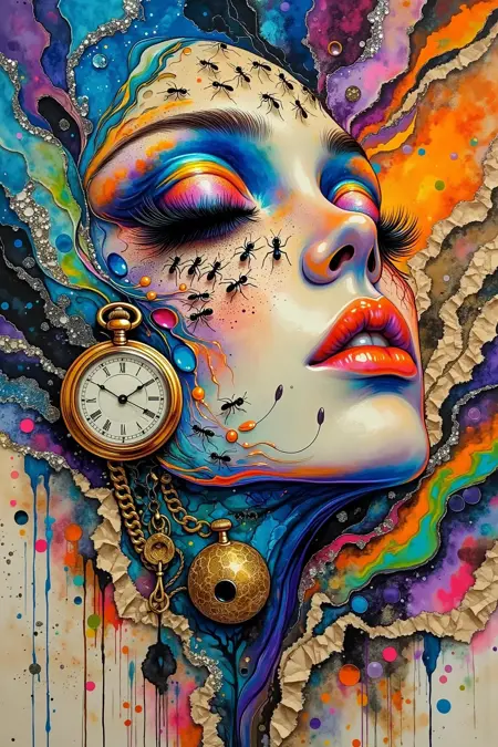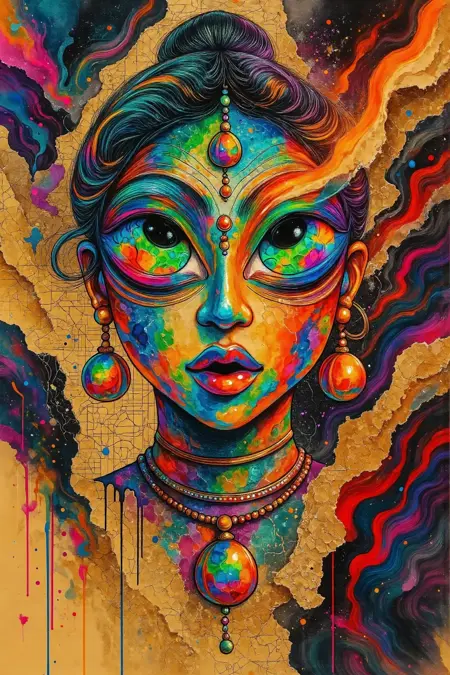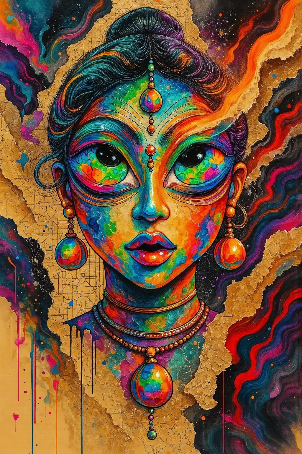 Style: Vibrant, high-detail, abstract and surreal digital art. Mixed media style, blending physical and digital art techniques. 🎭