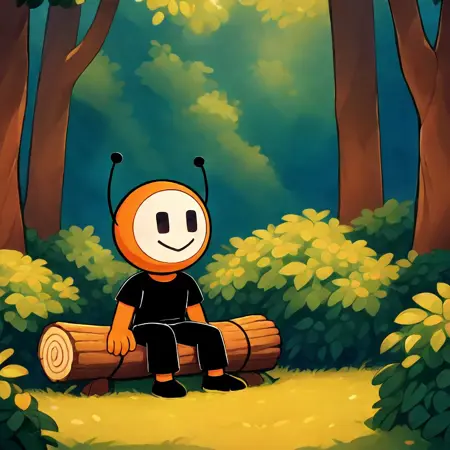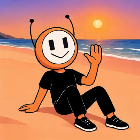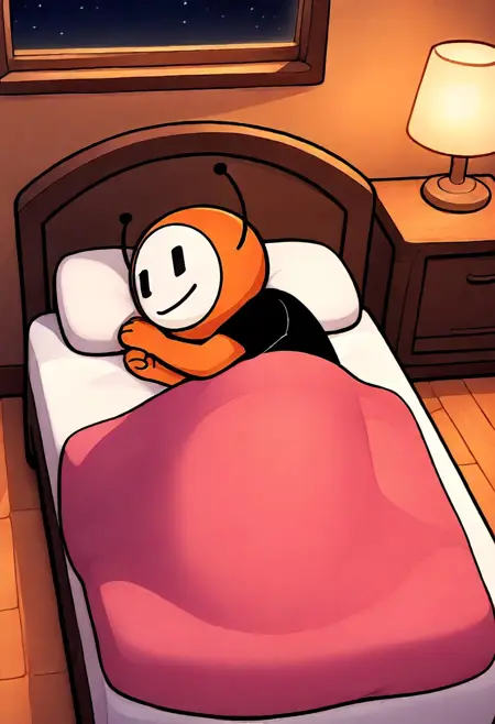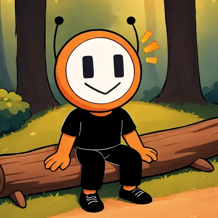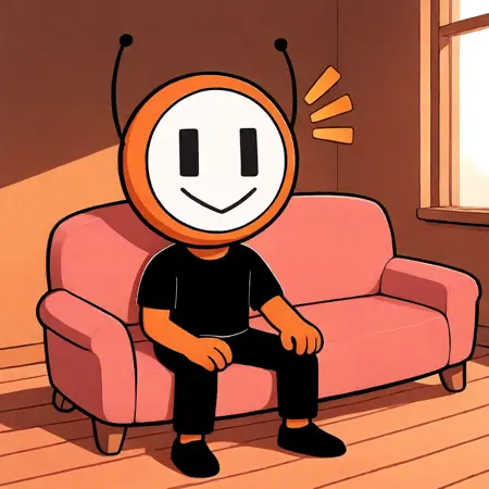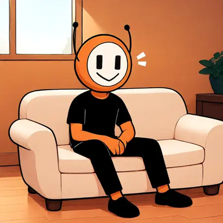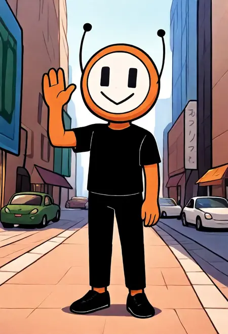 dbot, 黒いズボン, 靴, 黒いシャツ, オレンジ色の肌, 触角, シャツ, 短めの袖, ズボン, 黒い目, 白い顔, 笑顔, 高解像度, 名作, シングル, 男性, 視聴者を見つめる, 手を振る, 立っている, リアルな背景, リビングルーム